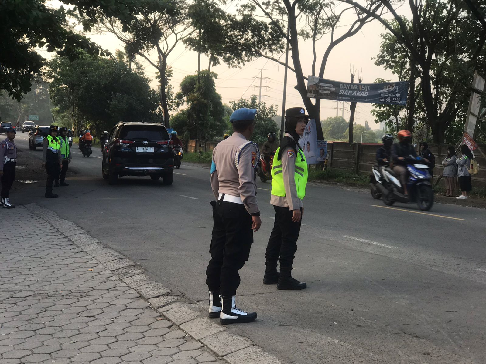 Cilegon,Polres Cilegon Polda Banten Pada Selasa/03/01/2026 Pukul 06.30 Wib, Personil Siwas Polres Cilegon, Aipda Emi Prasetyo melaksanakan kegiatan pengaturan arus lalu lintas di Jalur Protokol jalan utama Kota Cilegon tepat nya di jalur depan perumahan arga baja Pura Kota Cilegon.