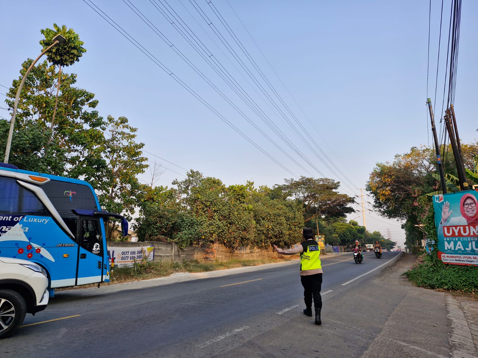 Cilegon,Polres Cilegon Polda Banten Pada Selasa/03/01/2026 Pukul 06.30 Wib, Personil Siwas Polres Cilegon, Aipda Emi Prasetyo melaksanakan kegiatan pengaturan arus lalu lintas di Jalur Protokol jalan utama Kota Cilegon tepat nya di jalur depan perumahan arga baja Pura Kota Cilegon.