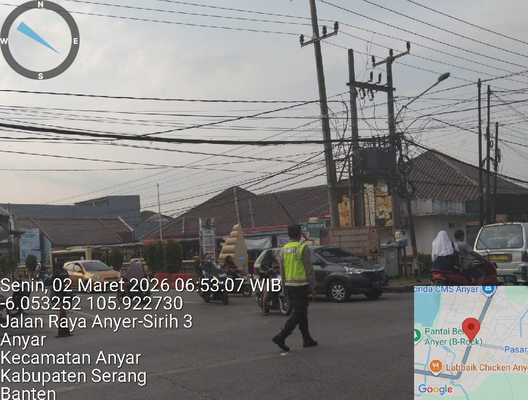 Cilegon – Polres Cilegon Polda Banten, Dalam Mewujudkan Aksi Nyata Pelayanan Kepada Masyarakat, Personil Polsek Anyer Polres Cilegon Laksanakan Strong Point Pengaturan Lalu lintas, Senin (02/03/2026).