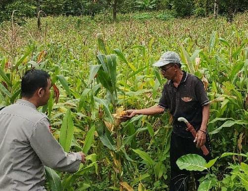 Dalam kegiatan monitoring ini, Bhabinkamtibmas meninjau langsung kondisi lahan jagung.