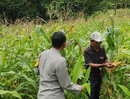 Dalam kegiatan monitoring ini, Bhabinkamtibmas meninjau langsung kondisi lahan jagung.