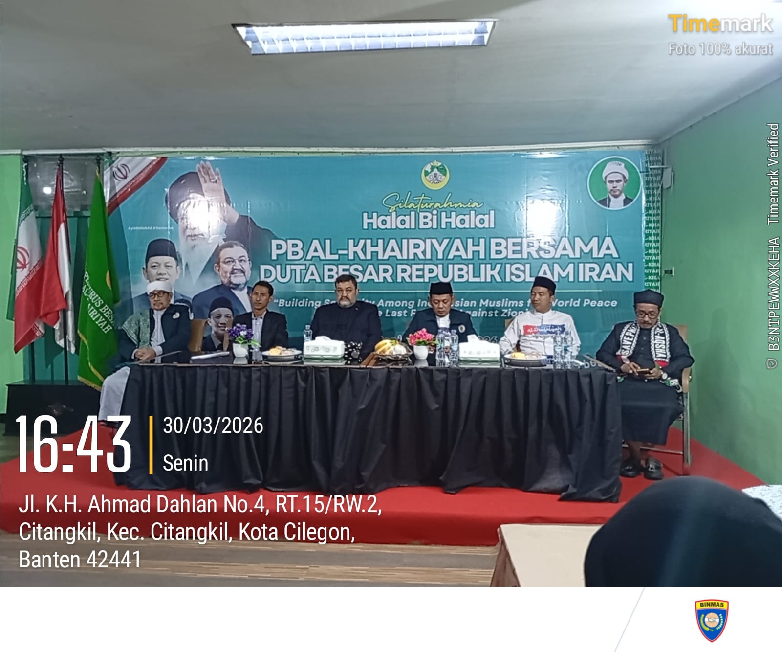 Cilegon -  Bhabinkamtibmas Kelurahan Citangkil Polsek Ciwandan Polres Cilegon Polda Banten AIPDA Warudin, menghadiri kegiatan Halal Bihalal PB Alkhairiyah bersama Duta Besar Republik Islam Iran, MUMAMMAD BOROUJERDI, dan tim di Aula PB Alkhairiyah, Citangkil, Senin (30/03/2026).