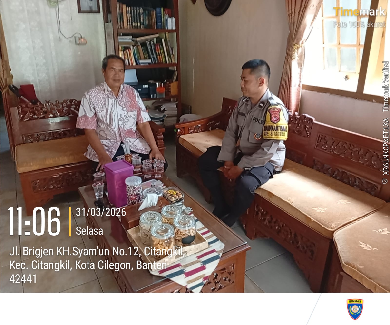 Cilegon - Giat sambang ini merupakan salah satu tugas rutin Bhabinkamtibmas yakni dengan melaksanakan kunjungan kepada warga masyarakat binaannya untuk menjalin silaturahmi yang lebih erat dan menyampaikan pesan-pesan kamtibmas serta mencari informasi yang berkembang di masyarakat agar tercipta situasi kamtibmas yang aman dan kondusif, Selasa (31/03/2026).