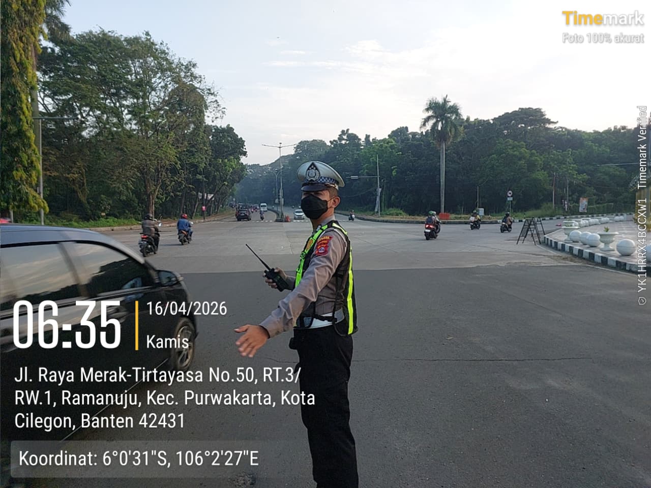 Cilegon, Satlantas Polres Cilegon Polda Banten – Berikan pelayanan kepada masyarakat Kasat lantas Polres Cilegon AKP Ridwan memerintahkan jajaran lalulintas untuk melaksanakan pengaturan lalu lintas di penggal – penggal jalan yang rawan kemacetan di Kota Cilegon, (Kamis,16/4/2026)