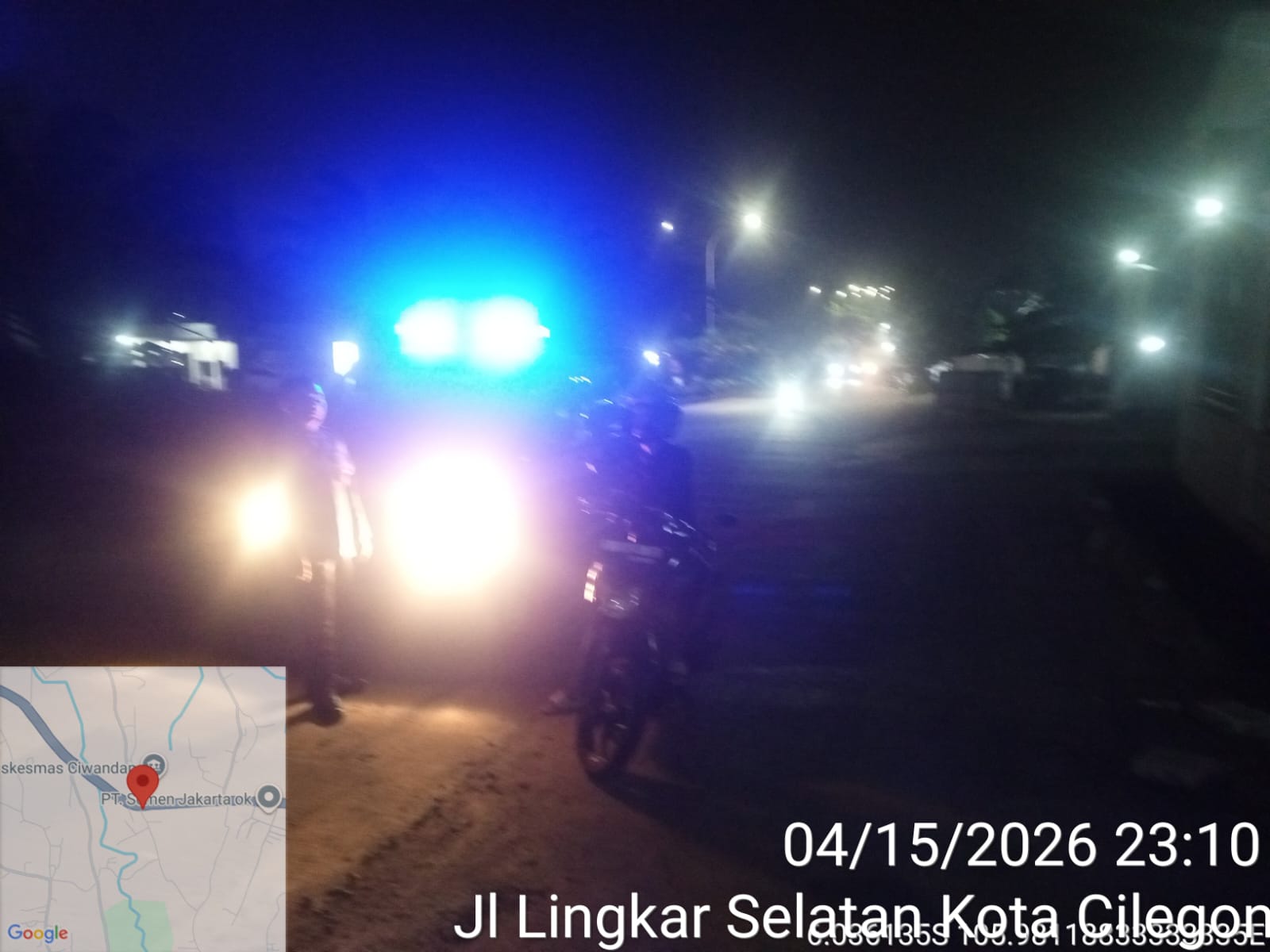 Cilegon - Personil Polsek Ciwandan Polres Cilegon Polda Banten Dalam Pelaksanaan Kegiatan Patroli dengan menyalakan lampu rotator berwarna biru di Daerah Hukum Polsek Ciwandan Polres Cilegon Polda Banten dari malam hingga dini hari, dalam rangka menciptakan situasi aman dan kondusif, Kamis (16/04/2026).