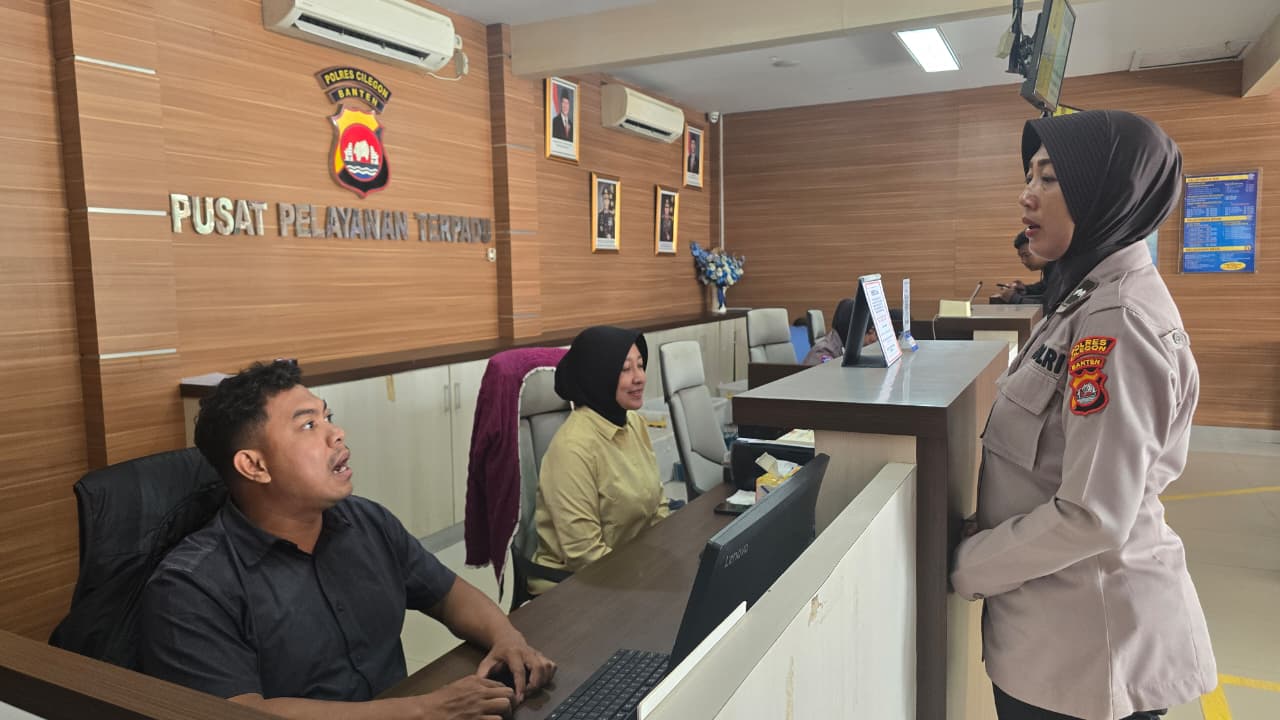 Polwan Polres Cilegon Aipda Emi Prasetyo Selaku Personil siwas Polres Cilegon Melakukan pengechekan dan monitoring pada pelayanan Izin Kermaian pada sat Intel Polres Cilegon.